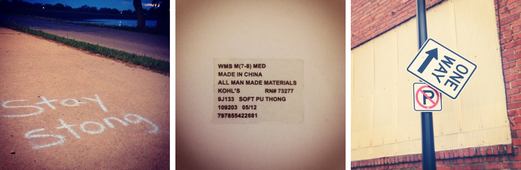 These grabbed my attention because of their placement. The peace sign is a small part of installation art, but the landscape gave me a true feeling of San Francisco. The Dairy Queen sign itself isn’t that remarkable, but the sky behind turns it into art. I took the photo of the Southwest Airlines wing on the way to California because I liked the idea of an advertisement with the world as its background. When I saw the “Good Order Unit” tag, conspiracies flooded my mind until someone told me it was actually a repair or inspection tag from a local business, but for a second my imagination had a lot of fun. If these signs were in other environments, the same emotions or stories would’ve never existed.