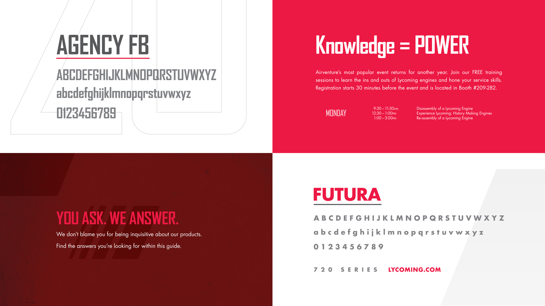 Lycoming’s previous branding was cast in dark colors, which didn’t quite suit a company that creates the beating heart of an aircraft. The somber shades were substituted with metallic grays and a vibrant red. More white was introduced into designs. Now Lycoming ads feel light, airy, and appropriate for content related to flight. The new aesthetic also brings cohesion to Lycoming’s marketing.