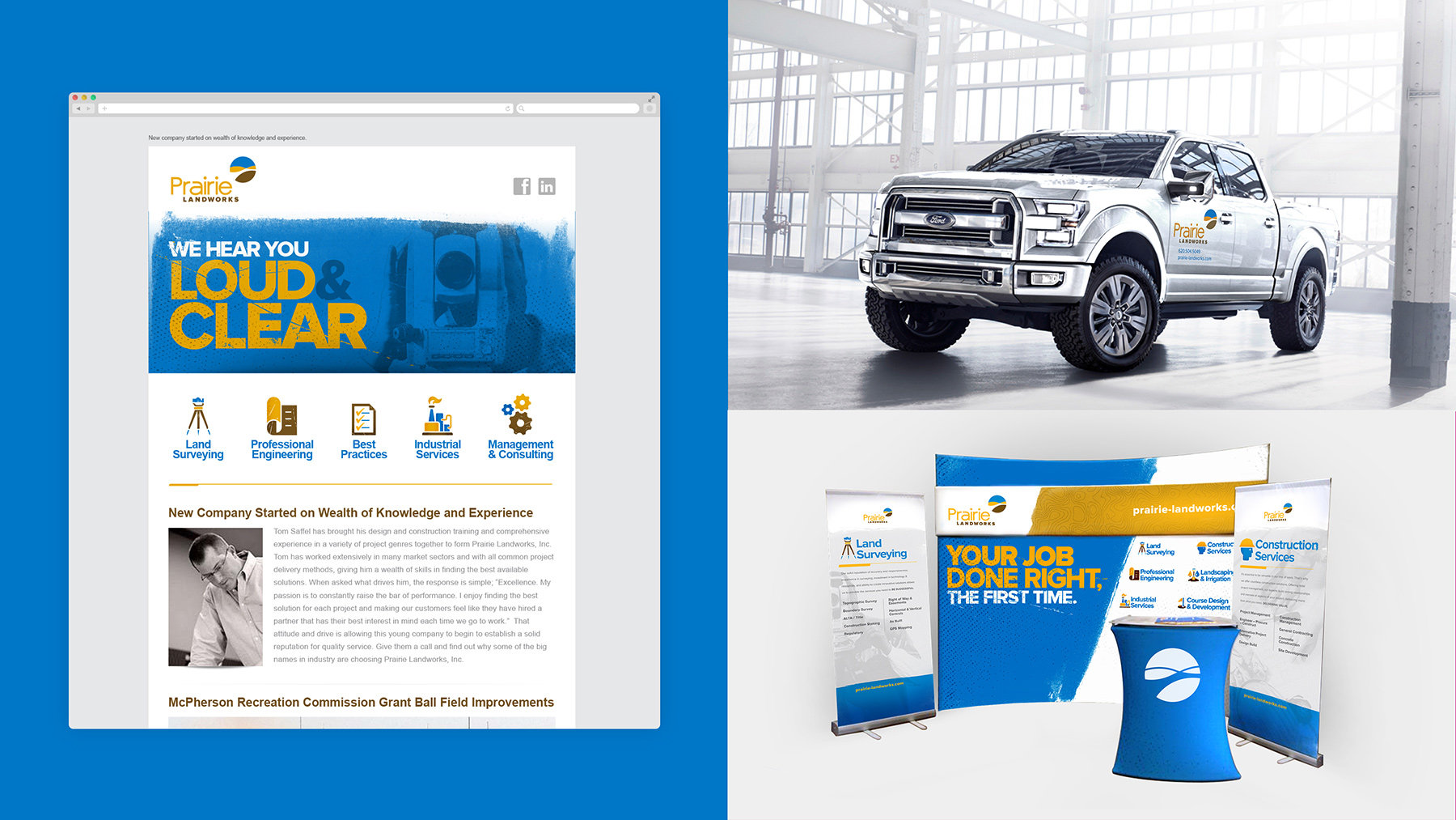 In 2012, our brand design firm serviced a startup land surveying company, Prairie Landworks. Using vibrant gold, blue and brown, we created a distinctive logo and brand identity that spoke to a prospective client. This visual design presented the attitude and focus of service while exuding confidence and expertise in their industry.