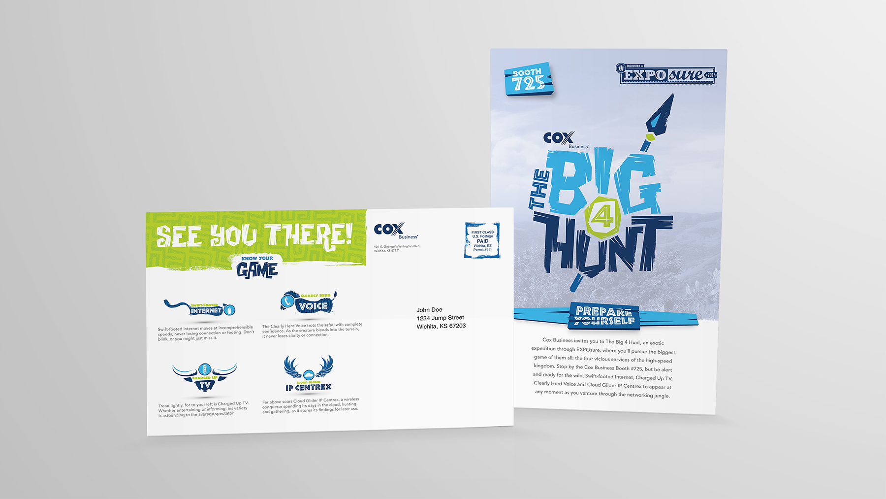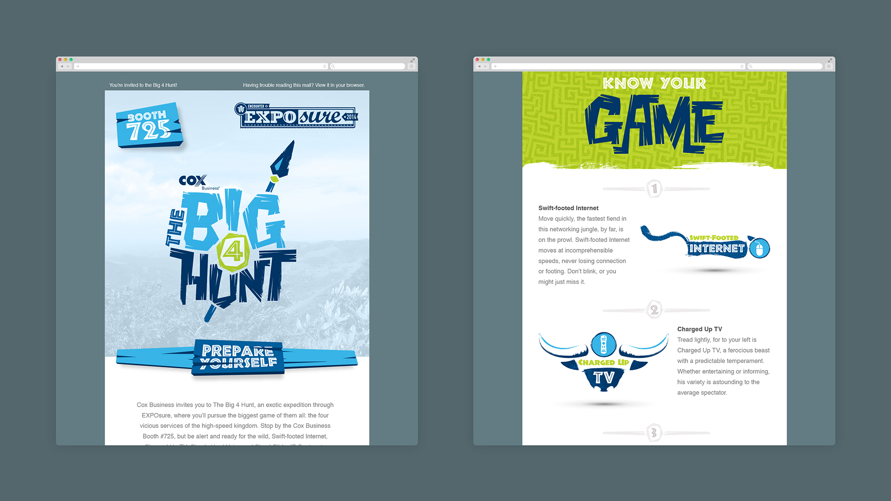 For this event, we created a unique theme to set them apart from other businesses — the Cox Business Big 4 Hunt. Based on Big 5 Game hunting in Africa, the Big 4 Hunt was safari themed, highlighting the four services as game for customers to “hunt.”